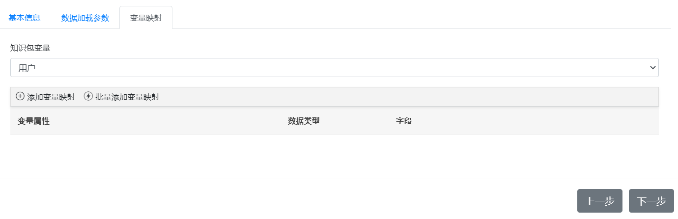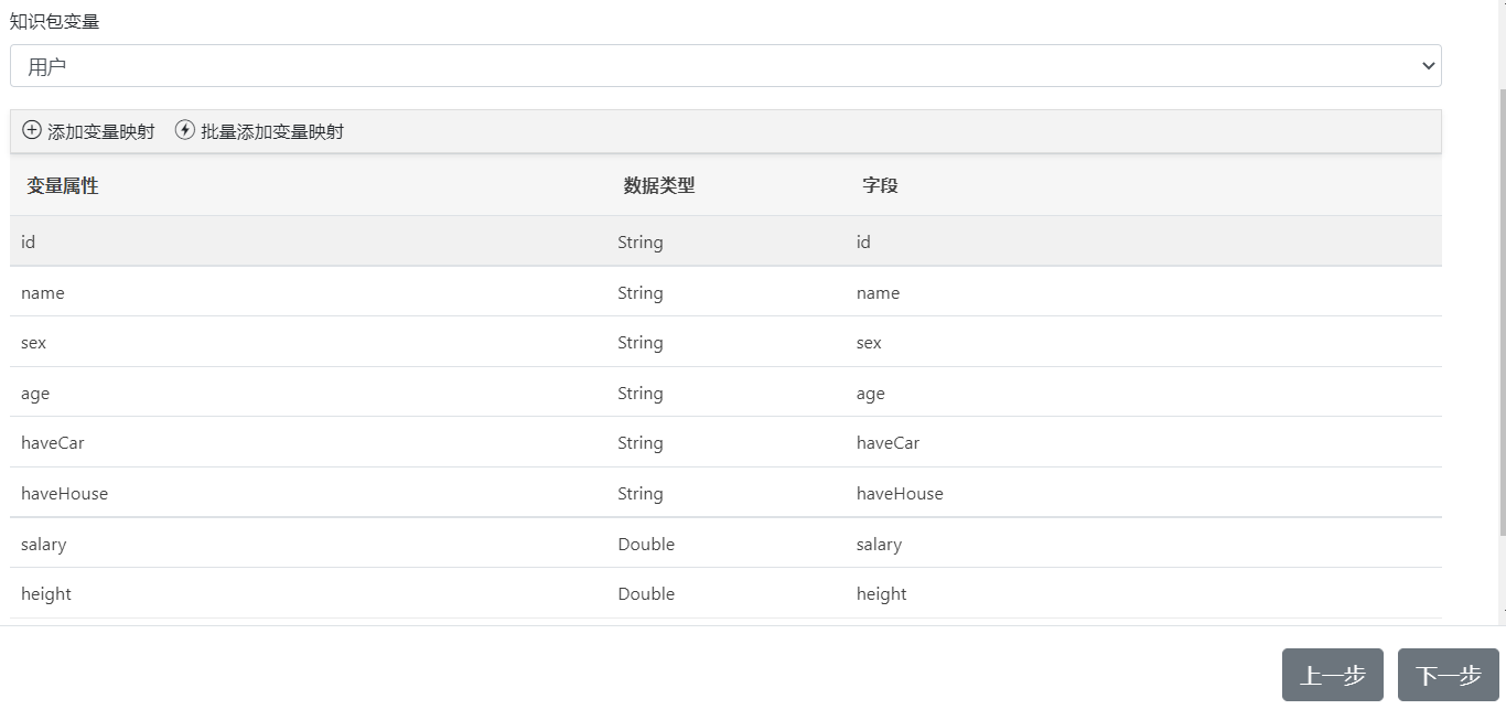 - 选择知识包中需要映射的变量,因为一条数据将作为调用知识包的入参进行知识包调用。