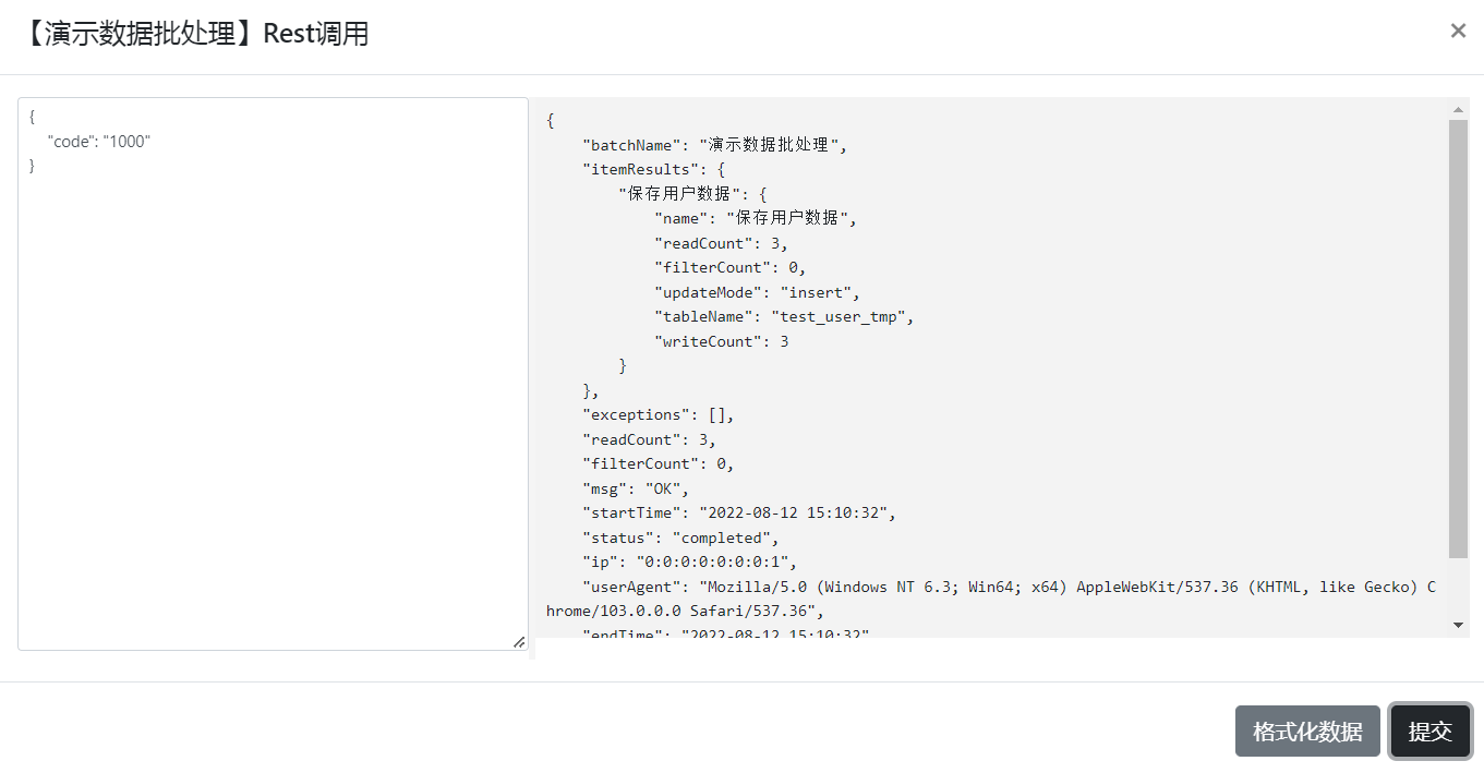 可通过【REST调用】功能,进行快速触发当前数据批处理,如果设置的是同步执行,提交触发后将处理结果返回,返回信息包含执行状态等信息。