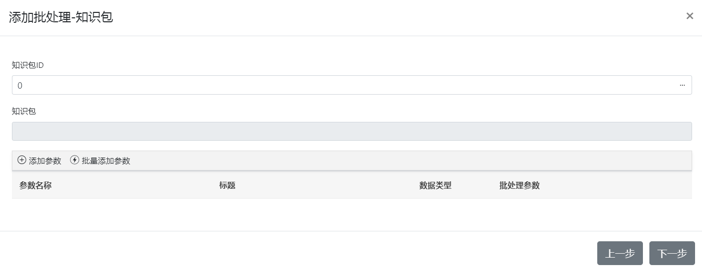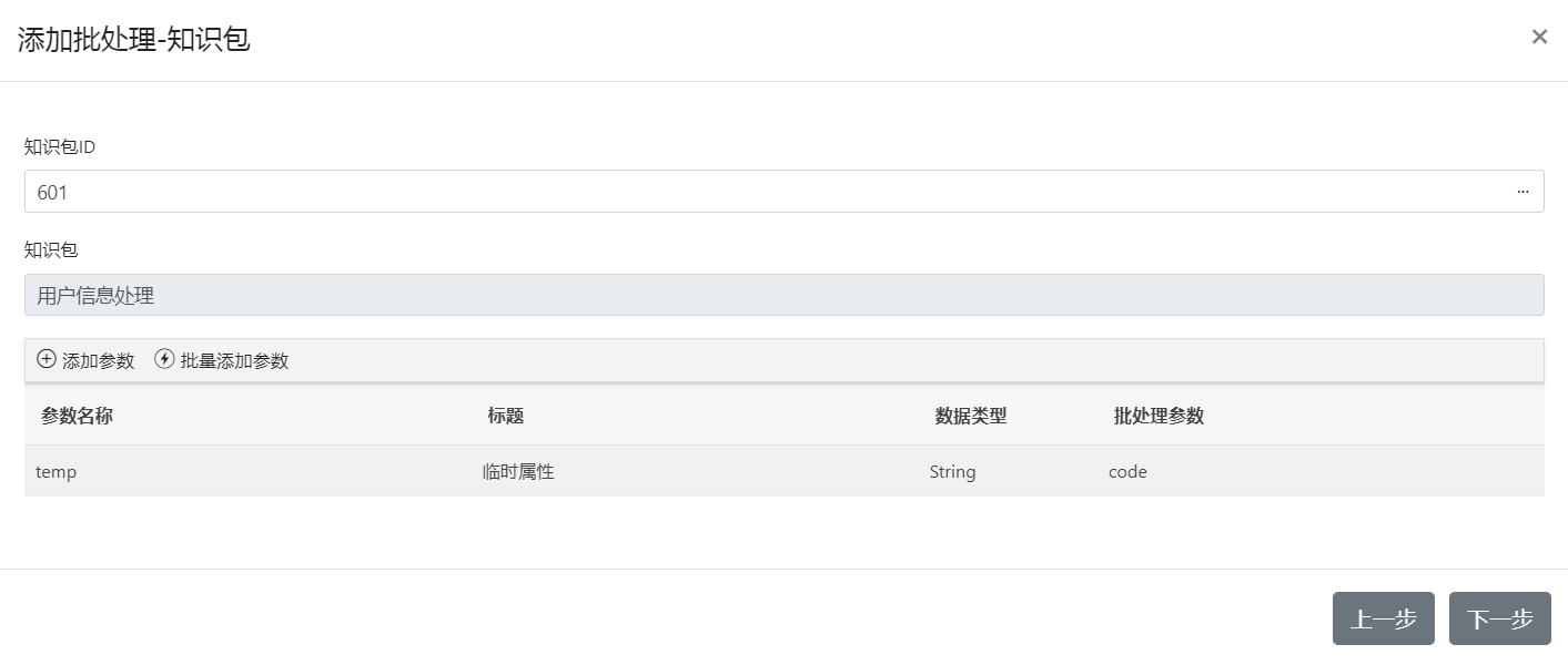 选取好知识包后,知识包有参数需要绑定批处理参数可以通过【添加参数】手动添加,或者通过【批量添加参数】选取知识包中参数进行添加。