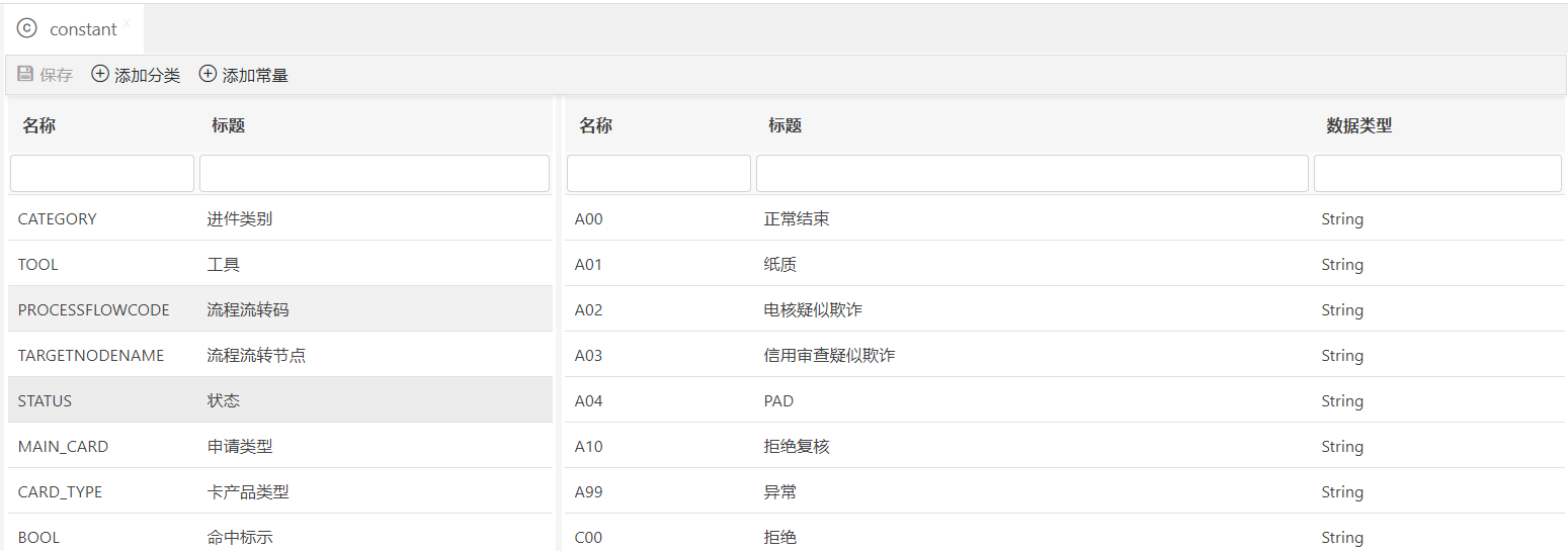 与变量库文件类似,常量也是由分类和具体的常量值构成,比如性别有男女之分,那么这里的“性别”就属性分类,“男”、“女”就属性具体的常量值。在常量的分类中,“名称”一般定义具体的分类名,“标题”是一段描述(比如“性别”是标题,“gender”是名称),同样这个标题也会出现在规则引用当中;加好分类后就可以添加这个分类下具体的常量值,常量值也有名称和标题之分,名称是具体的常量值,标题则是描述,比如“男”是标题,"true"是名称,同样“女”是标题,“false”是名称。