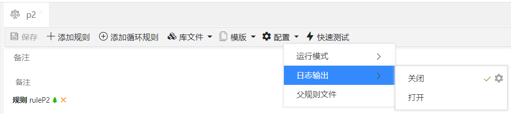 在向导式规则集文件当中,为了更好的统一控制日志开关,在设计器上方的配置按钮菜单下提供了一个针对当前文件级的日志开关控制的菜单项,如下图所示: