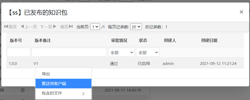 配置完成后,进行项目的知识包管理页面,查看某个知识包的已发布知识包,在弹出窗口可以看到已发布的知识包列表,选中某条需要推送到客户端的知识包,点击右键,在弹出菜单中选择推送到客户端,如下图: