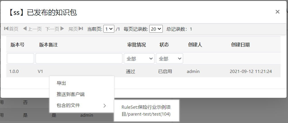 在项目的知识包管理页面中,选择目标知识包,点击右键,在弹出菜单中选择查看当前已发布的知识包,在弹出窗口中选择需要导出的已发布的知识项,点击右键,在弹出菜单中选择导出,如下图所示:
