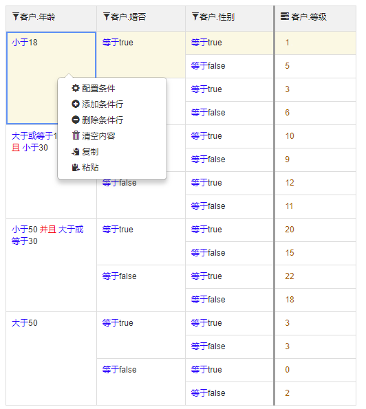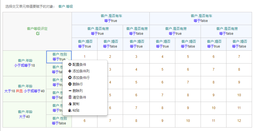 在URule Pro提供的普通评分卡当中,只能针对某一个对象的一些属性进行评分,这种评分方式可以满足大部分评分系统的需求,但在某些复杂的评分需求中,需要对多个对象的不同属性进行叠加组合评分,针对此类需求,URule Pro提供了复杂评分卡功能。复杂评分卡的配置方式与决策表有些类似,只是对于条件列头只能选择具体的对象,而每个条件单元格在配置条件时都需要选择与当前列头选择的对象对应的具体属性,这样就可以满足任意复杂的评分需求。