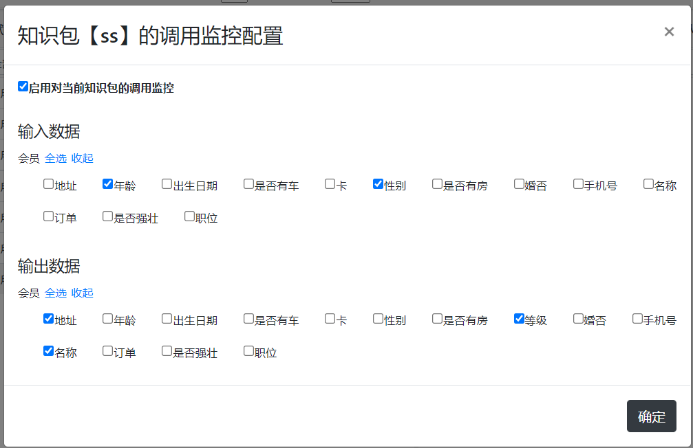 勾选“启用对当前知识包的调用监控”选项后,就可以看到具体可配置的监控选项,整个监控的选项分为两个部分,既输入数据以及输出数据。