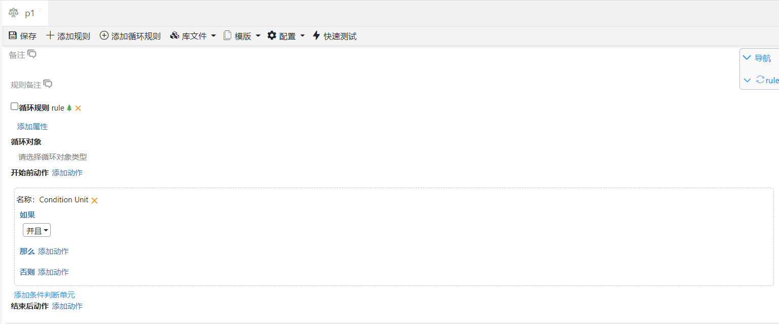 开始前动作定义完成后就可以定义循环规则的循环单元部分,对于一个循环规则来说可以有一个或多个循环单元,每个循环单元都是一个普通规则的规则体,也就是一个由如果、那么、否则三部分构成的普通,定义方式与普通规则完全相同。