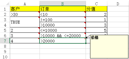 可以看到,在这个Excel当中,第一行用于定义列头,除最后一列外,前几列定义的是评分卡条件列采用的变量分类名,比如上图中的“客户”和“订单”,这两个对象要求我们必须预先在当前项目的某一个变量库文件里定义好,否则导入该Excel时会产生错误。 最后一列的列头名为“分值”,这里的“分值”是固定的,不能更改,这样导入的时候引擎就会认为该列是用于评分的列。