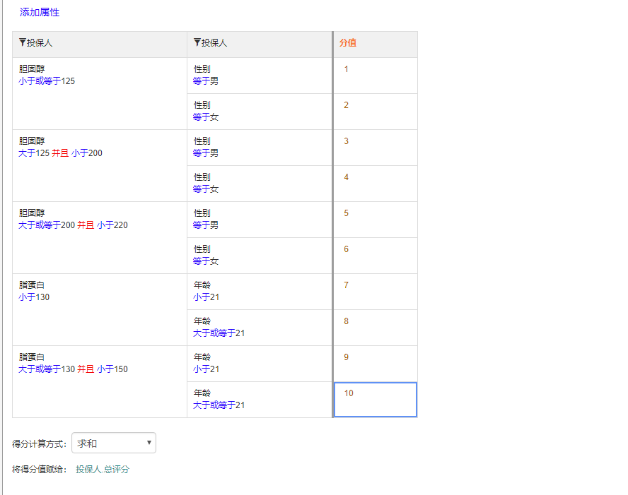 可以看到,这样表格与普通决策表的表格类似,通过一条加粗的灰黑色的线将整个表格分为左右两个部分,左边部分为条件定义部分,右边部分为分值列及自定义列定义部分。