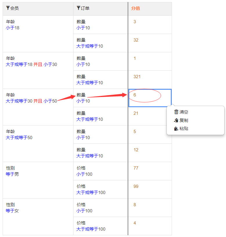 如上图中红色圆圈内分值为6的单元格所对应的条件就是会员对象的年龄属性要大于或等于30并且小于50,同时订单的数量属性要小于10,这样才会等到6分的分值。